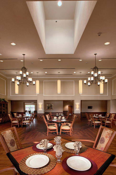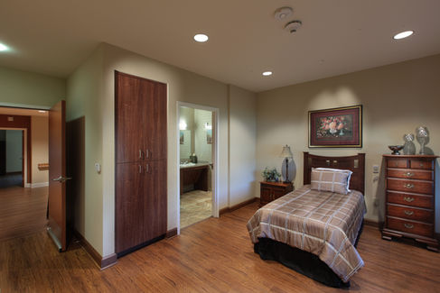 The Memory Care Unit of Rolling Meadows is a 22,142 square-foot self-contained, long term memory care unit. The new building connects to the existing Rolling Meadows nursing care wing. The unit houses 22 individual comfortable living/bedrooms with separate ADA compliant bathrooms. Facilities include a therapy room, an activity room, lounge/TV area, dining area, and food prep area. Although it’s a commercial building with light gauge steel trusses and steel stud walls, the exterior of the project was designed to complement and enhance the existing residential campus façade with brick veneer with stone trim, 30-year shingle roof system, shading canopies and main entrance drive-thru portico.
